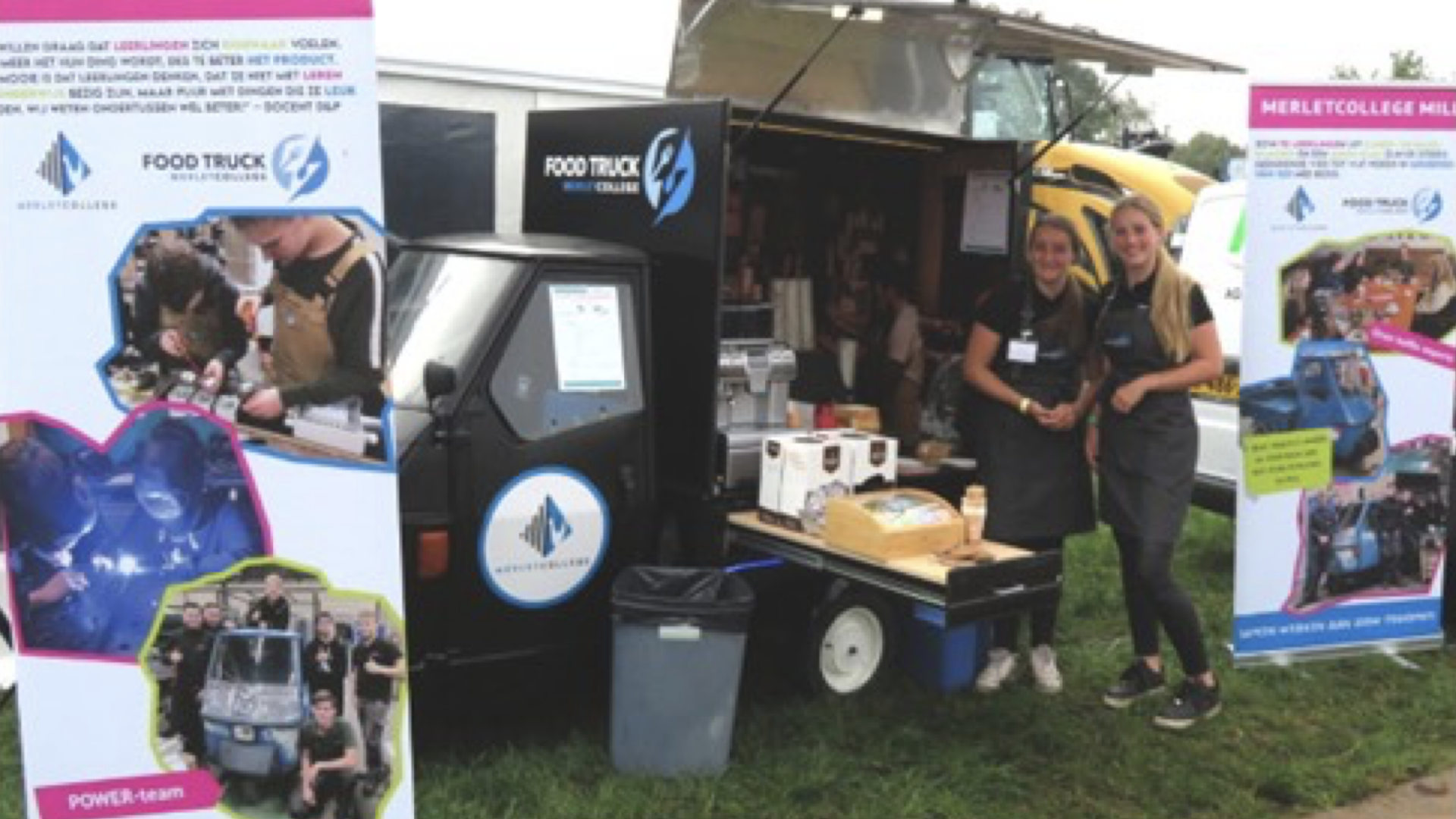 Docent Mario van Wetten werkt al jaren op het Merletcollege in Mill. Zijn weektaak vervult hij vooral met het lesgeven in Dienstverlening en Producten. Op het Merletcollege maken ze enthousiast gebruik van de vernieuwde modules van Dubbelklik voor Dienstverlening en Producten. Toen de leerlingen bezig waren met de Dubbelklik module Foodtruck, werden ze zo enthousiast dat ze graag een échte zouden kopen, inrichten en gebruiken voor de verkoop van producten. Mario regelde een Piaggio Ape. Het beste idee zou worden uitgevoerd. Leerlingen gingen aan de slag en het resultaat mag er zijn. Het werd een foodtruck voor koffie en thee, maar ook soep, belegde broodjes en koek zijn er te krijgen.