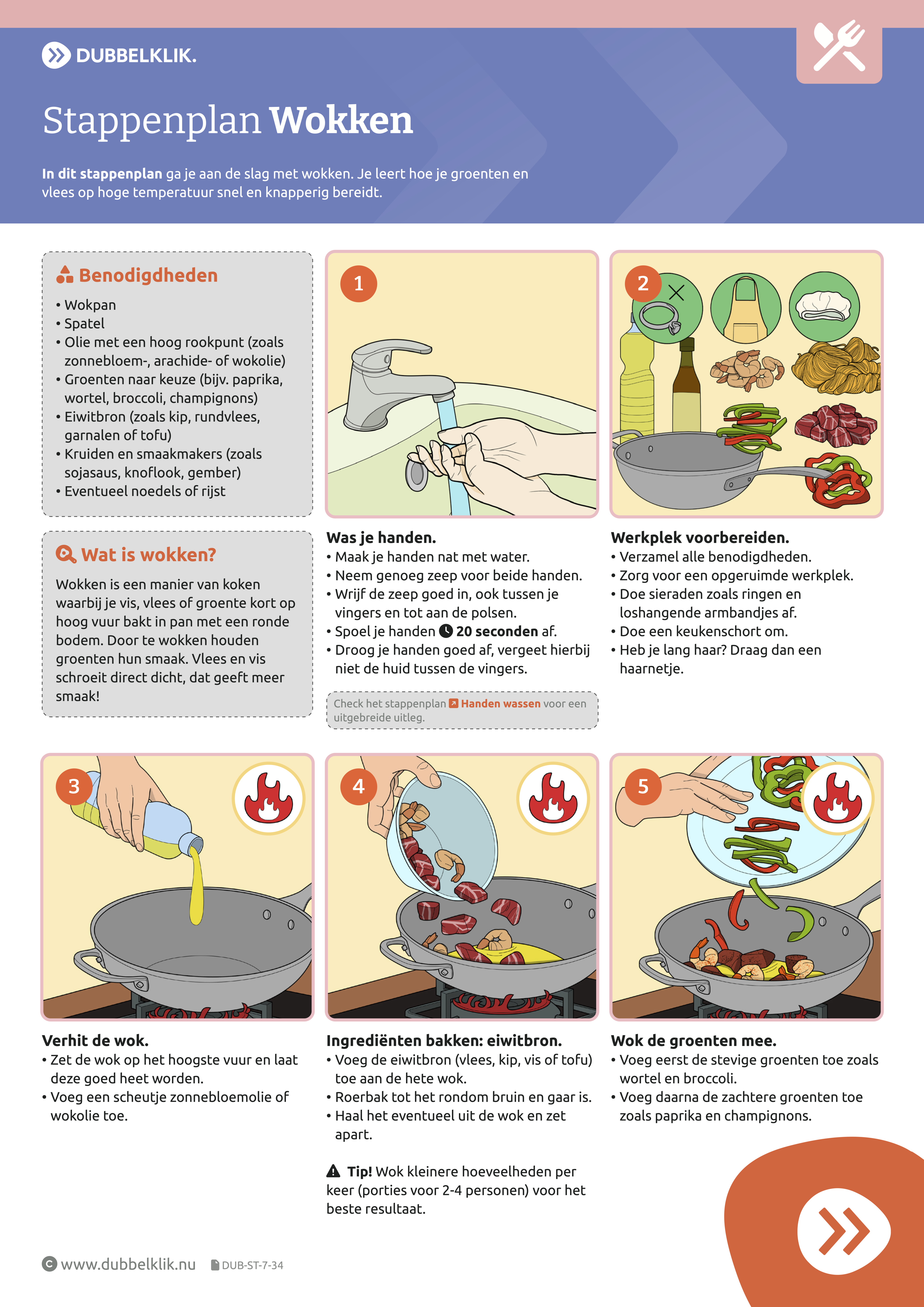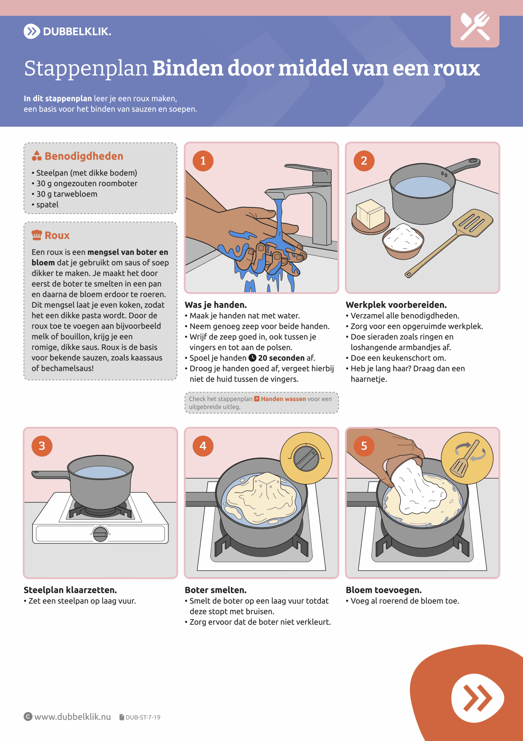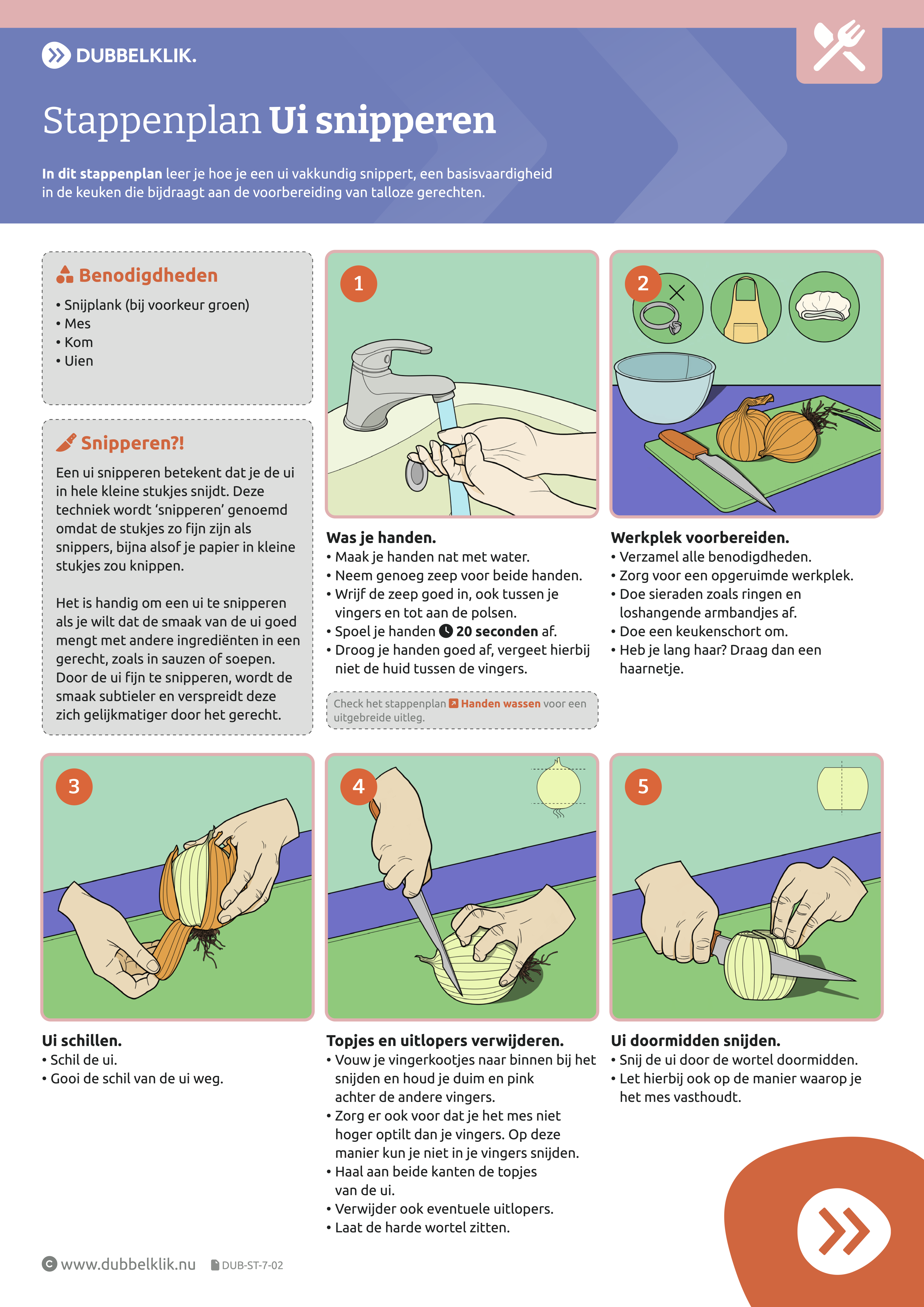 Met deze stappenplannenserie kunnen leerlingen stap-voor-stap allerlei vaardigheden aanleren die van pas komen in de keuken. Denk hierbij o.a. aan: bereidingstechnieken, omgaan met keukenapparatuur en het bedienen van klanten, maar ook aan algemene onderwerpen als: recept omrekenen, soorten snijplanken, koelkastindeling, enz. Bekijk hier het complete overzicht van alle kaarten in deze serie. Hieronder zie drie kaarten uit de serie.